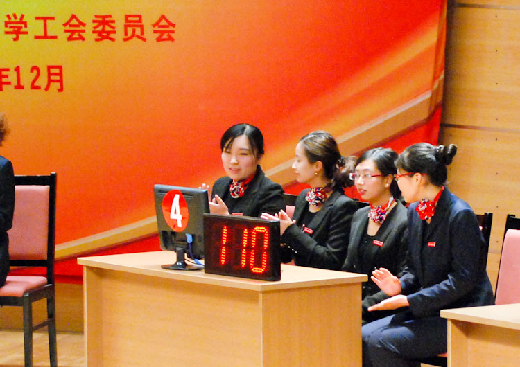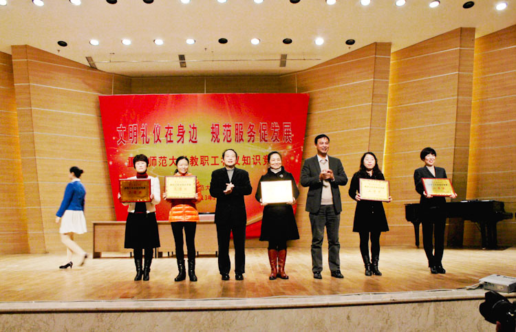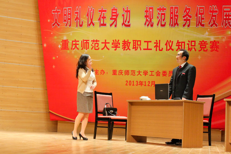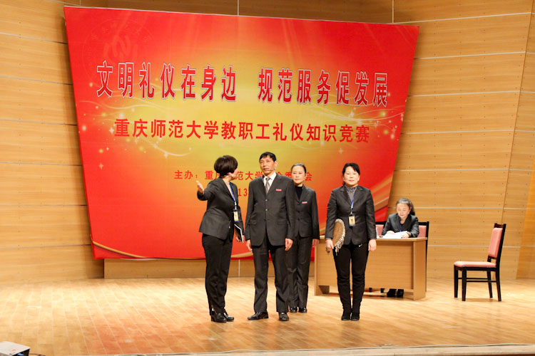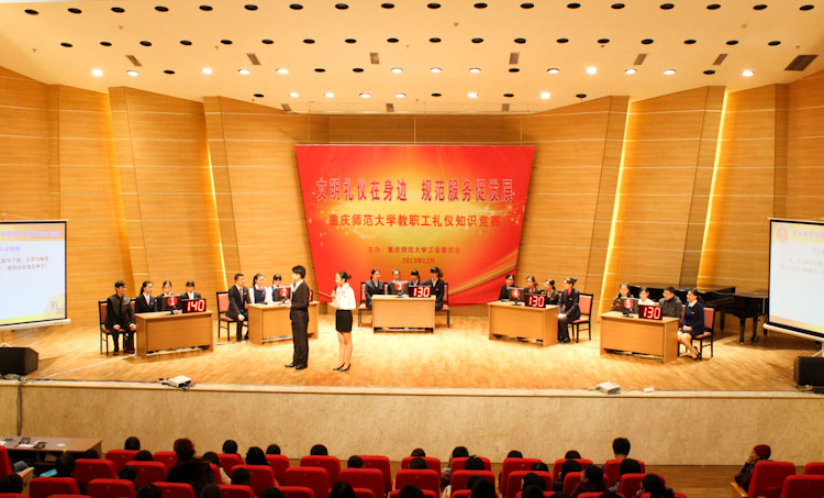 ??? 12月12日下午,由校工会举办的教职工礼仪知识竞赛活动在校友会堂音乐厅成功举行。党委邓卓明书记、纪委张尚毅书记以及相关部门的负责人等领导光临比赛现场,各单位师生代表近300人观看比赛。机关一、机关二、图书馆、后勤与公共资源管理、服务保障集团等五个工会参加了比赛。