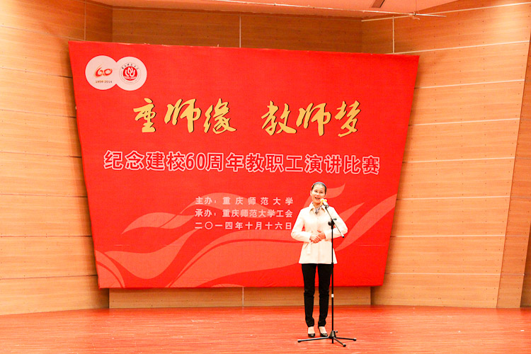 ??? 由校工会承办的这次教职工演讲比赛,是学校校庆系列活动之一,是老师们倾情参与校庆,各展其长,尽献绝技的又一次体现。选手中既有刚刚参加工作不久的年轻同志,也有工作几十年的老教师,他们以讲抒怀,以讲寄情,同叙重师情缘,共贺甲子祝福。台上精彩的演讲,一个个生动鲜活的事例,展现了一代又一代重师人艰苦奋斗、精心耕耘的感人画面,充分展示了我们重师人的精神风貌,也深情地表达了对我校60华诞的诚挚祝福。